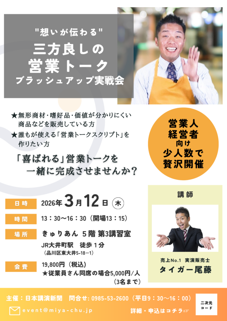 タイガー尾藤氏「想いが伝わる」営業トークブラッシュアップ実戦会 営業人・経営者向け、小人数で贅沢開催!! 日時:3月12日(木)開演13時30分~16時30分(開場13時15分)会場:きゅりあん 5階 第3講習室(品川……